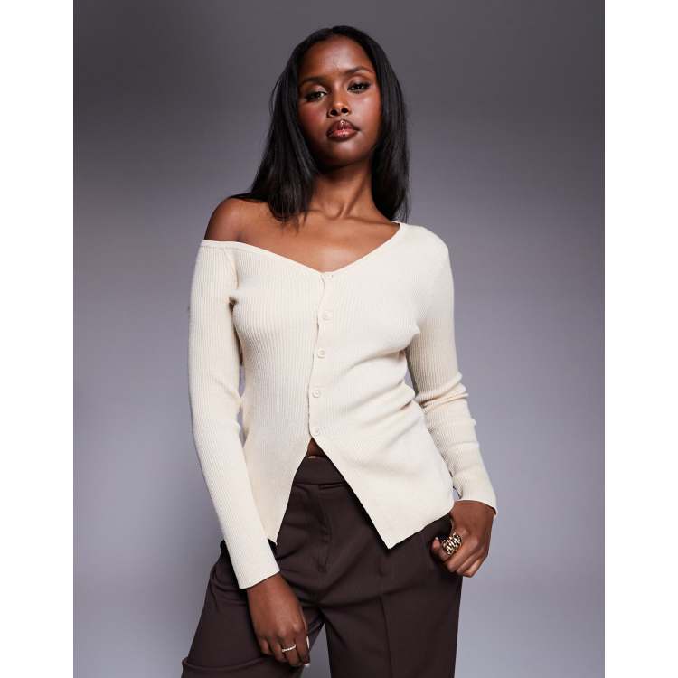 トップス Elf button knit tops beige Kaiia Exclusive off-shoulder button split front long sleeve knit